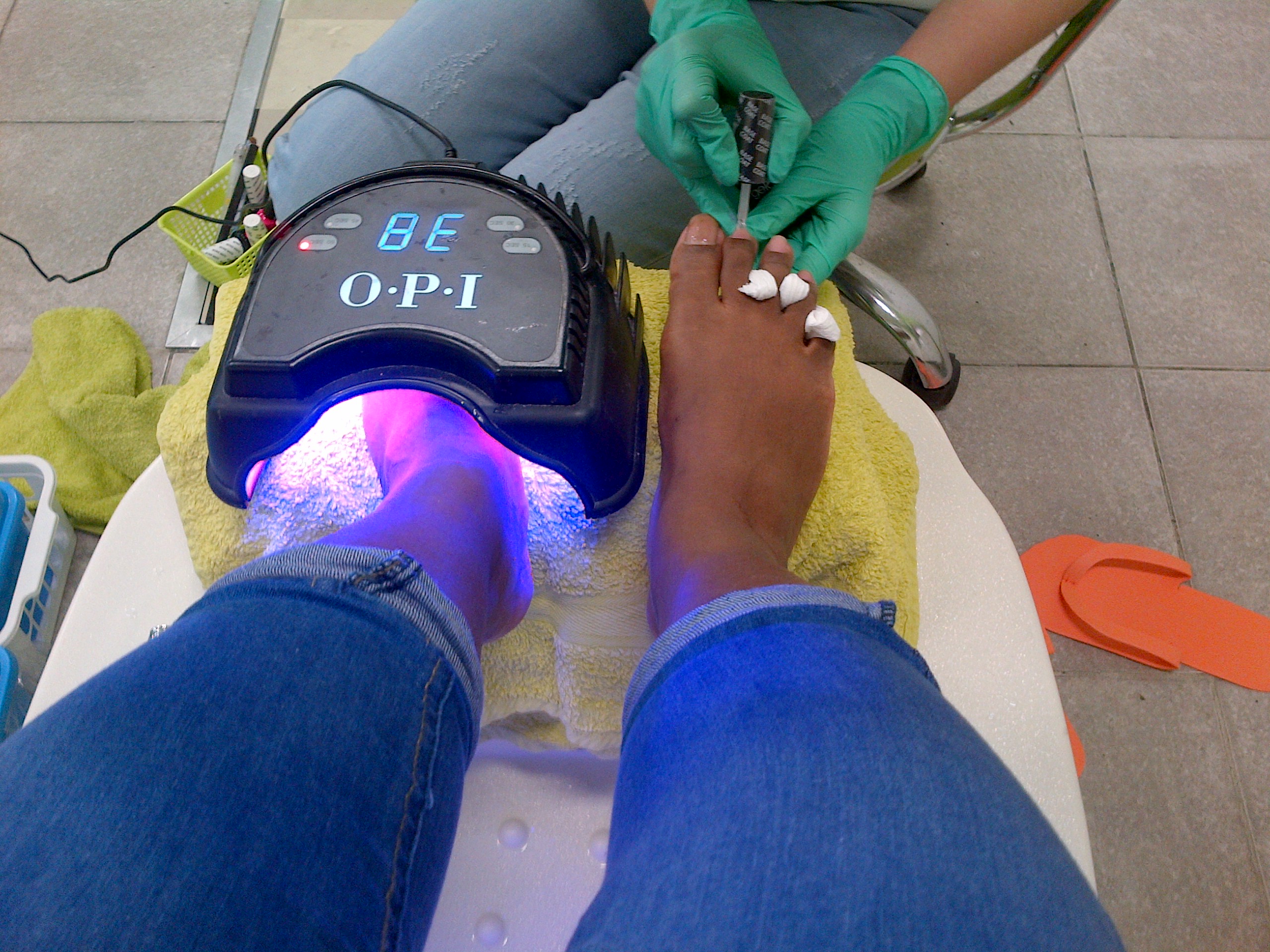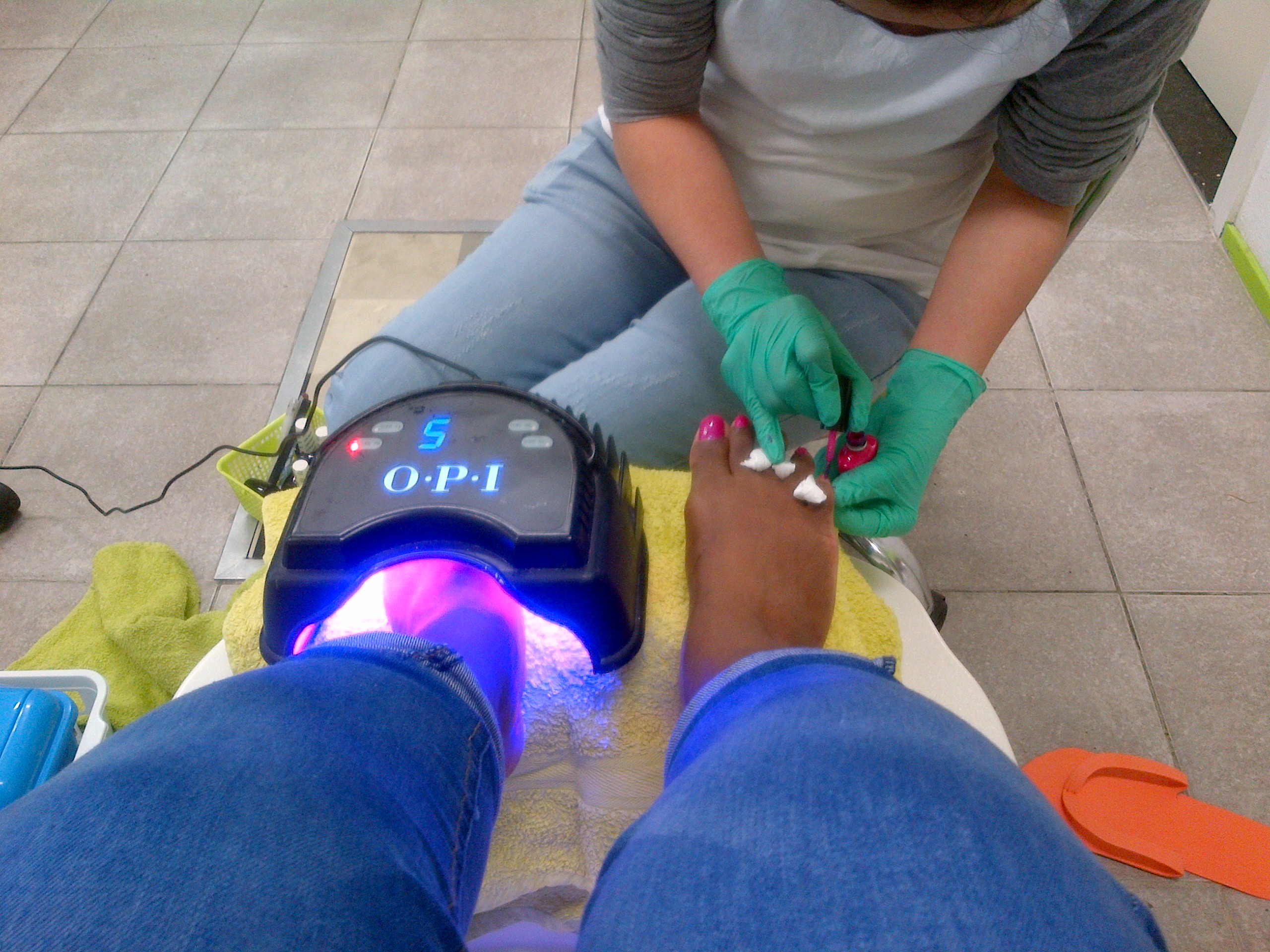 Now it’s time to take care off the nails. She polished the nails with a rotary pedicure nail polisher, put me in some cute orange flip-flops and send me to the rack of nail polish to pick a color. I went for hot pink.