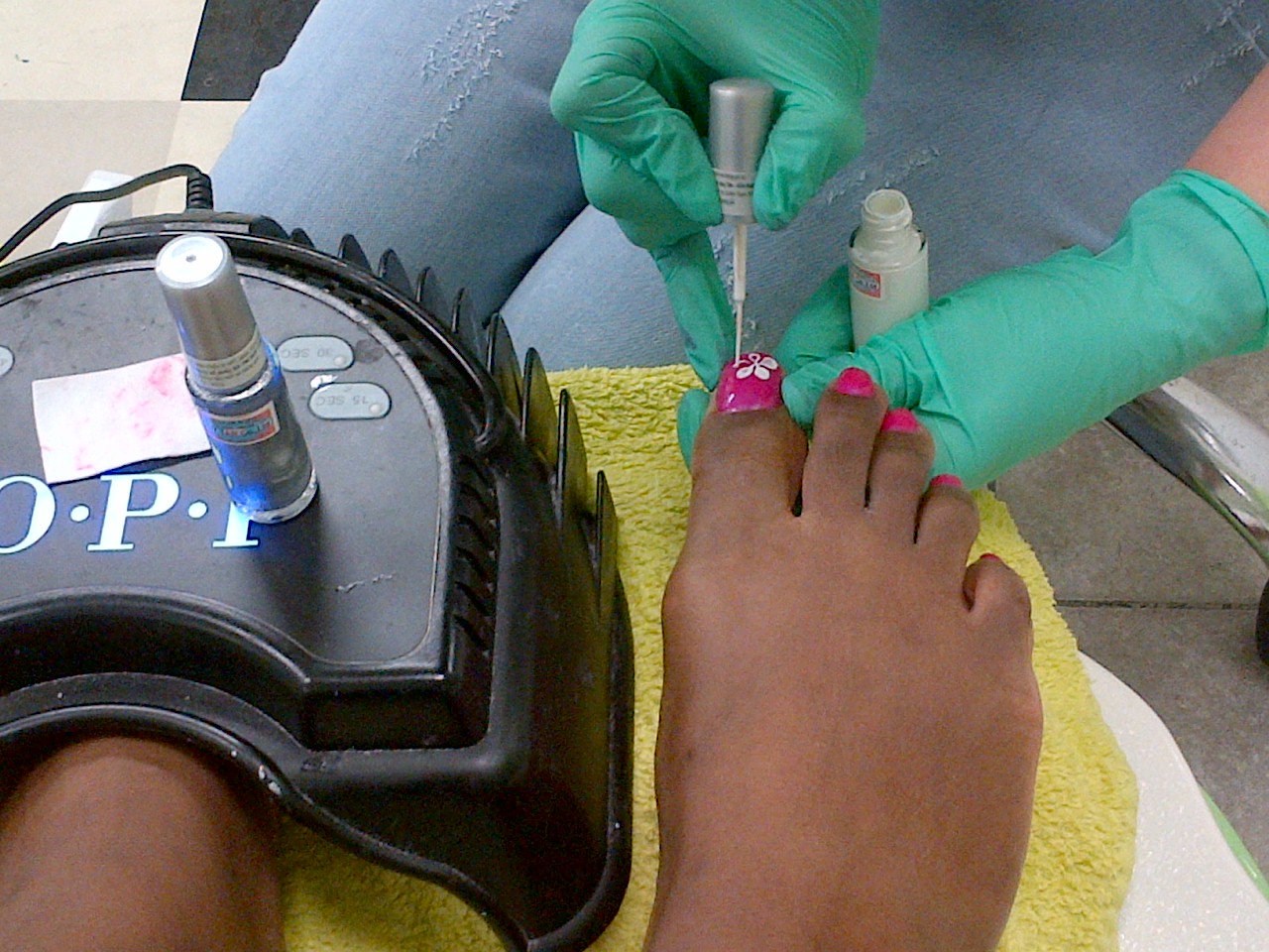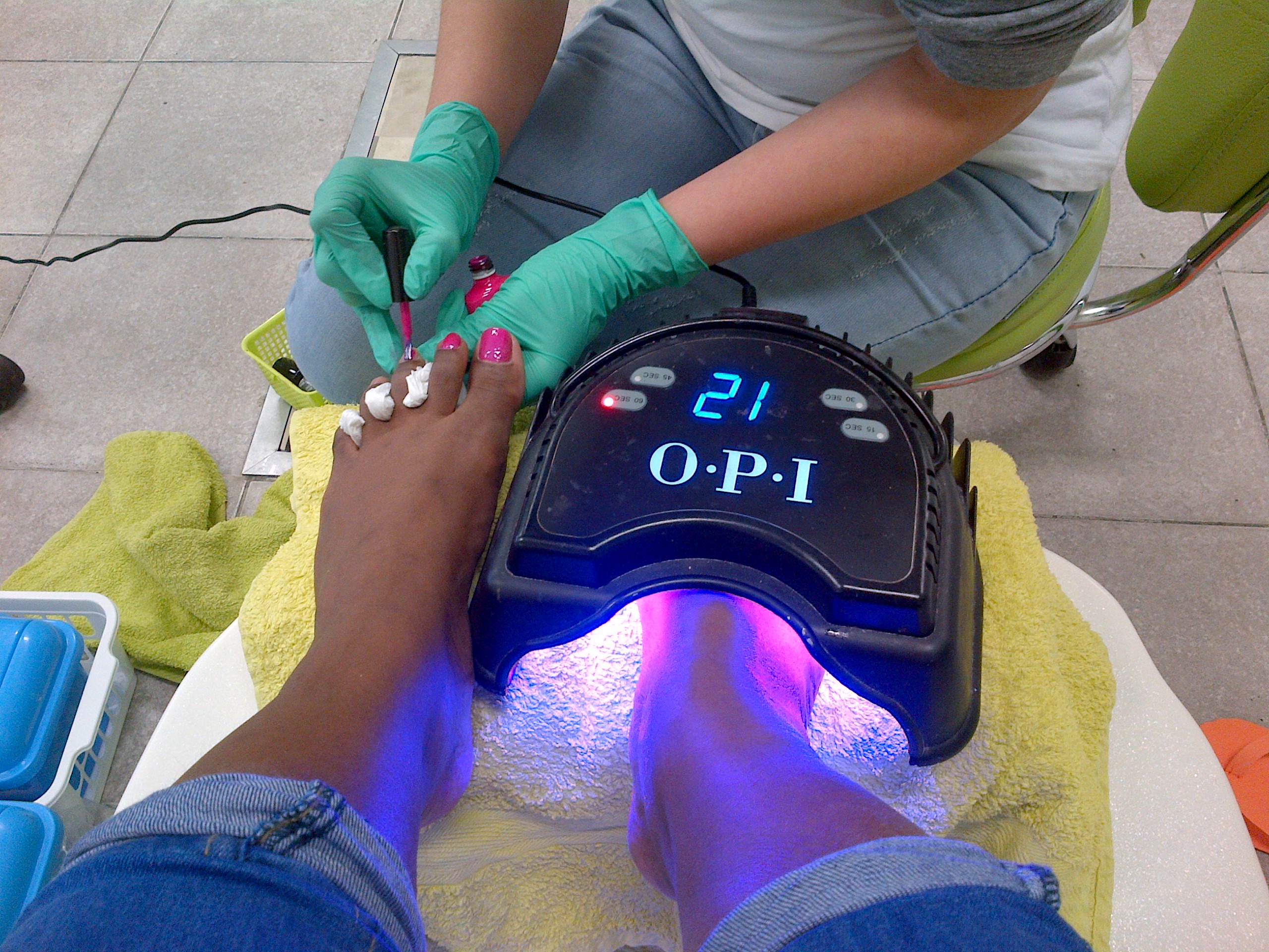 Because I choose gel nail polish this acquires a special dryer to dry the nail polish quick. First she started with a base coat on my left foot, put my foot under the dryer for a minute and did the same with my right foot. After that she applied the pink gel nail polish left, put my foot under the dryer for one minute, and did the same right. She applied two coats. After each coat of nail polish she put my foot under the dryer for one minute.