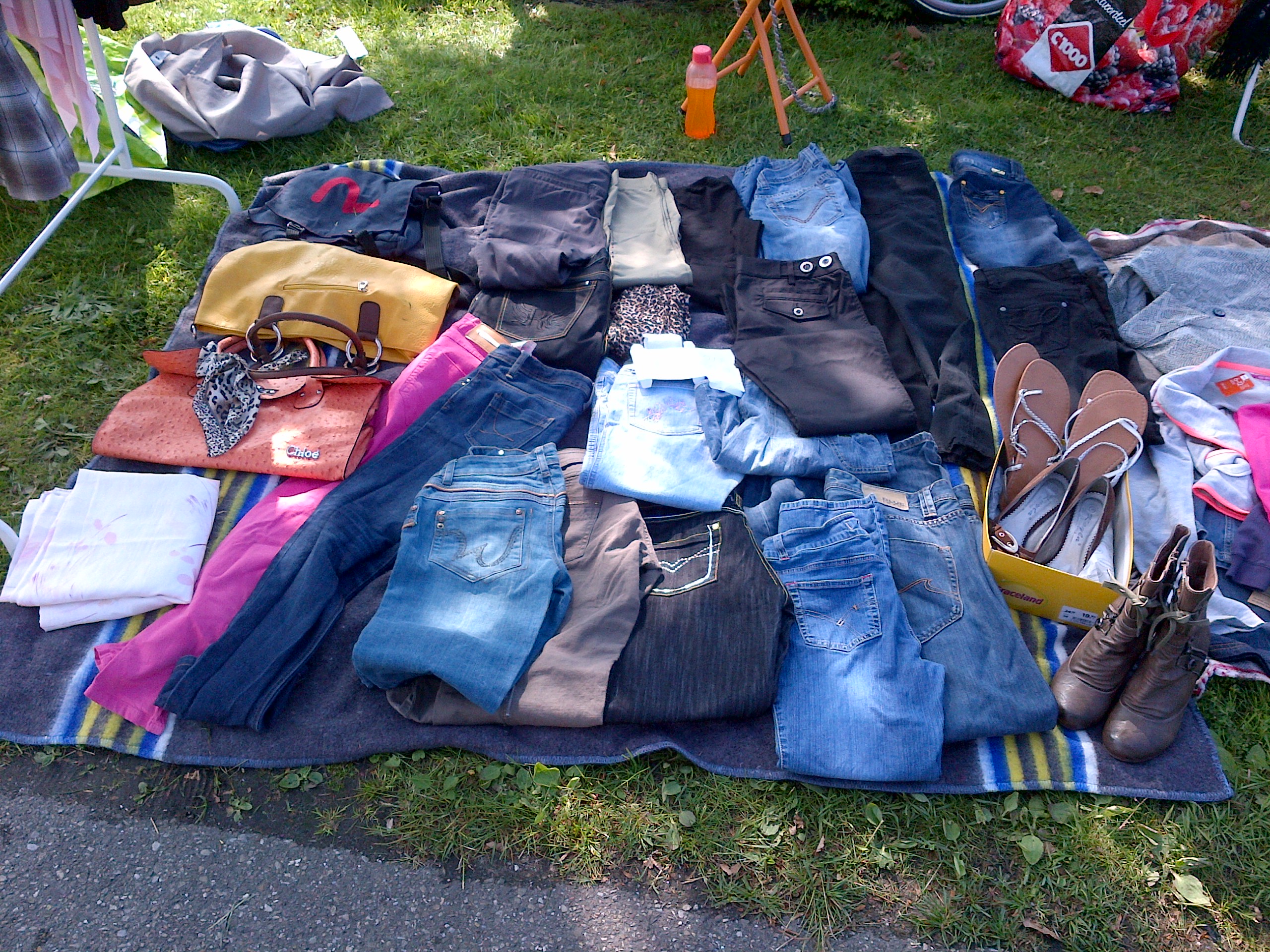 I had a lot of denim jeans and other trousers for sale. My oldest cousin her bags, skinny jeans (pink and dark blue) and boots are also featured in this picture: