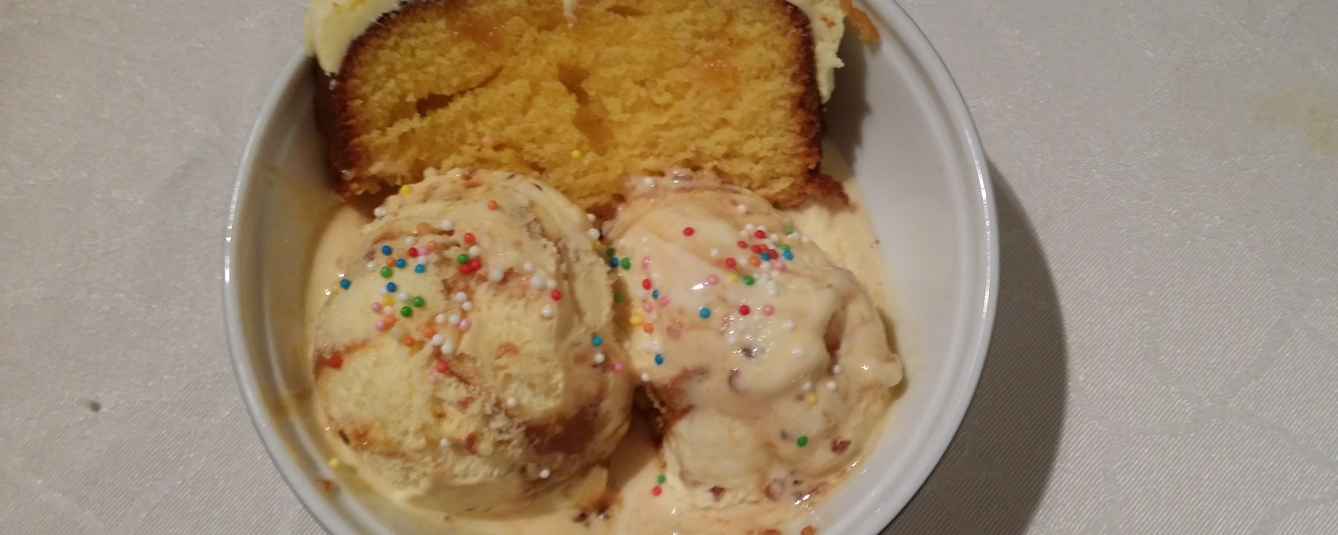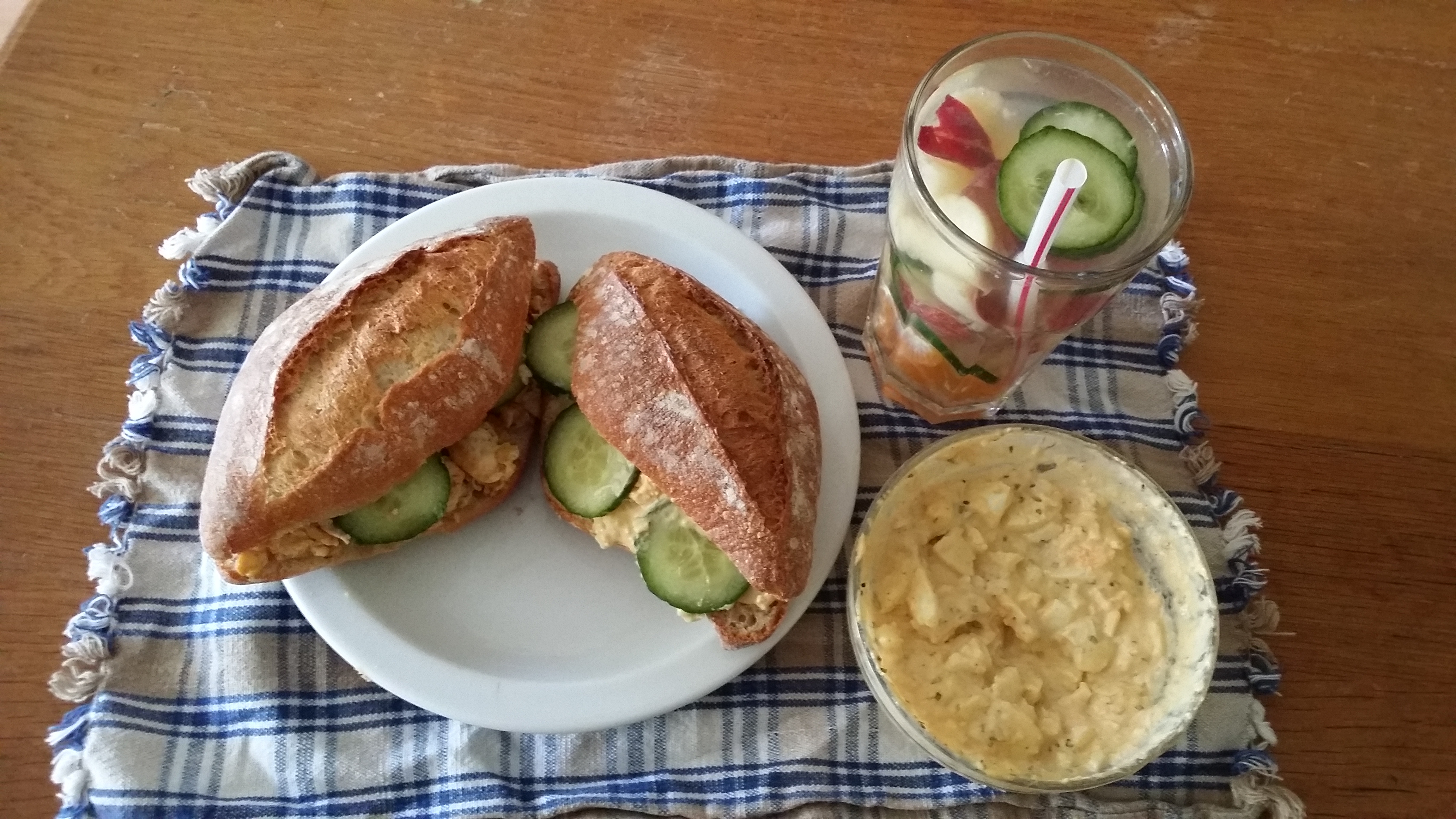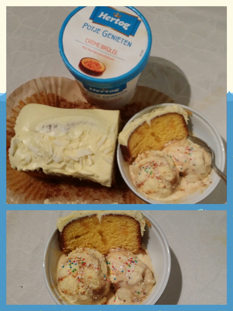 A healthy eggy lunch that existed out of two bake-off breads, one with scrambled eggs and the other one with egg salad. Combined with a refreshing drink: a glass of water with fruit and cucumber. After dinner I had a wonderful dessert which included a slice of lemon cake and two scoops of crème brûlée ice cream. It was yummy.
