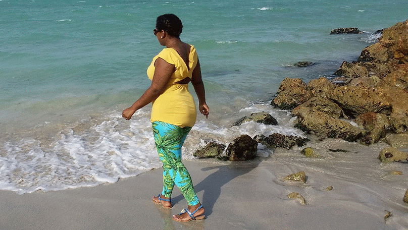 This time we were well prepared, left the house earlier, waited at the right platform and hopped on the bus to Hellshire Beach. For this day I wanted to have a tropical look that also goes well with the place I’m going. That’s why I broke in my Versace leggings. These were leggings from the Versace for H&M collection from a few years ago, but I never had an occasion to wear them. So that’s why I put them in my suitcase while packing, because Jamaica was the perfect place to wear these. Styled with a yellow top that I got in Suriname, and also never worn before, and my blue I love Su flat sandals, I created my Tropical Island outfit. Shades on and I was ready to go. Easy, simple and comfy.
