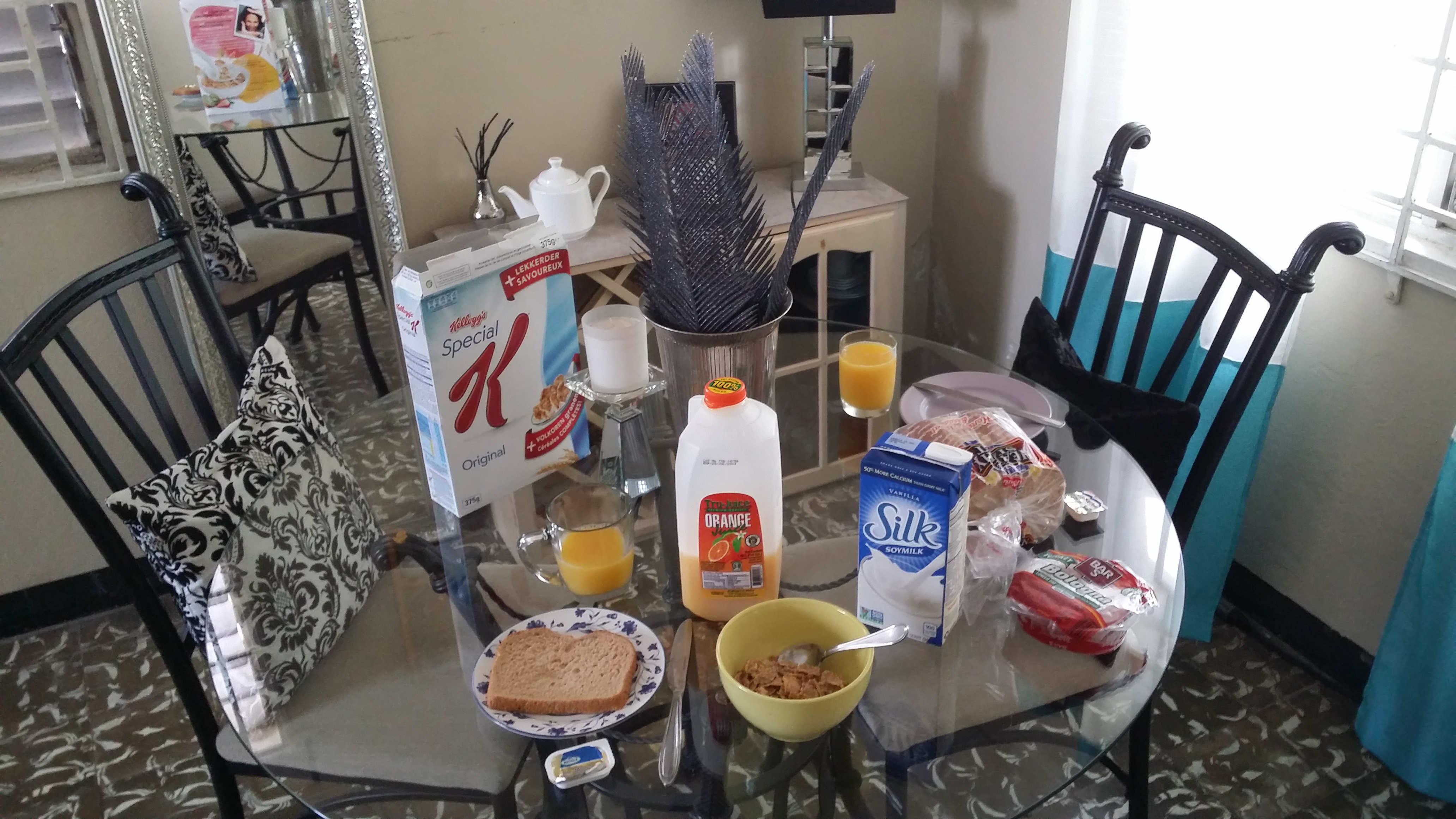Morning breakfasts with Special K original and Silk, orange juice and whole wheat bread. The best thing about having breakfast at this lovely table were the sunlight and singing birds:
