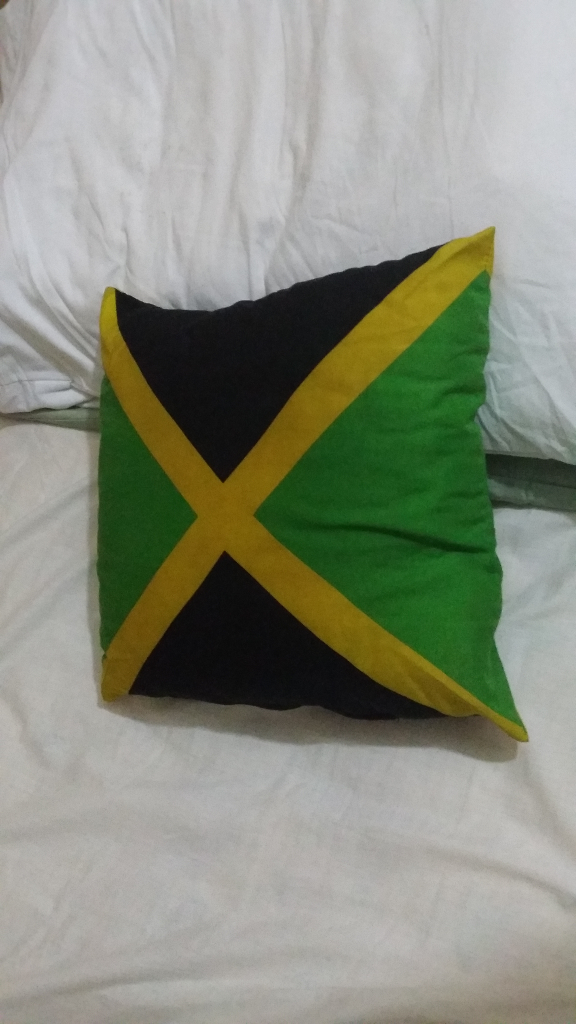 My pillow in his natural habitat. One of the two Jamaican flag pillows that I have for a few years now, which I bought on a vacation in Lloret de Mar, Spain. They’re like my teddy bears. No matter where I go, I always carry one of them around. Finally the pillow was home: