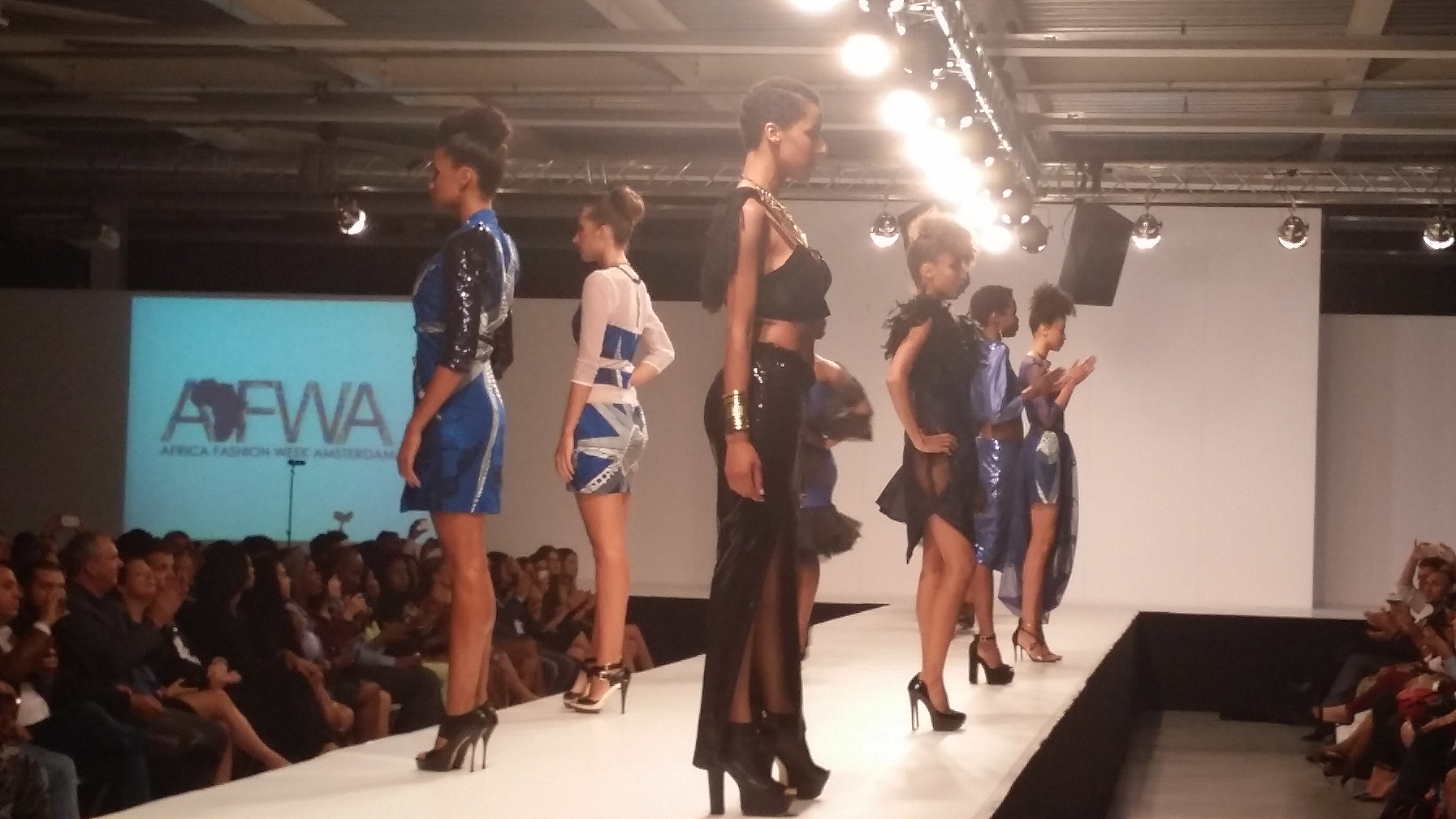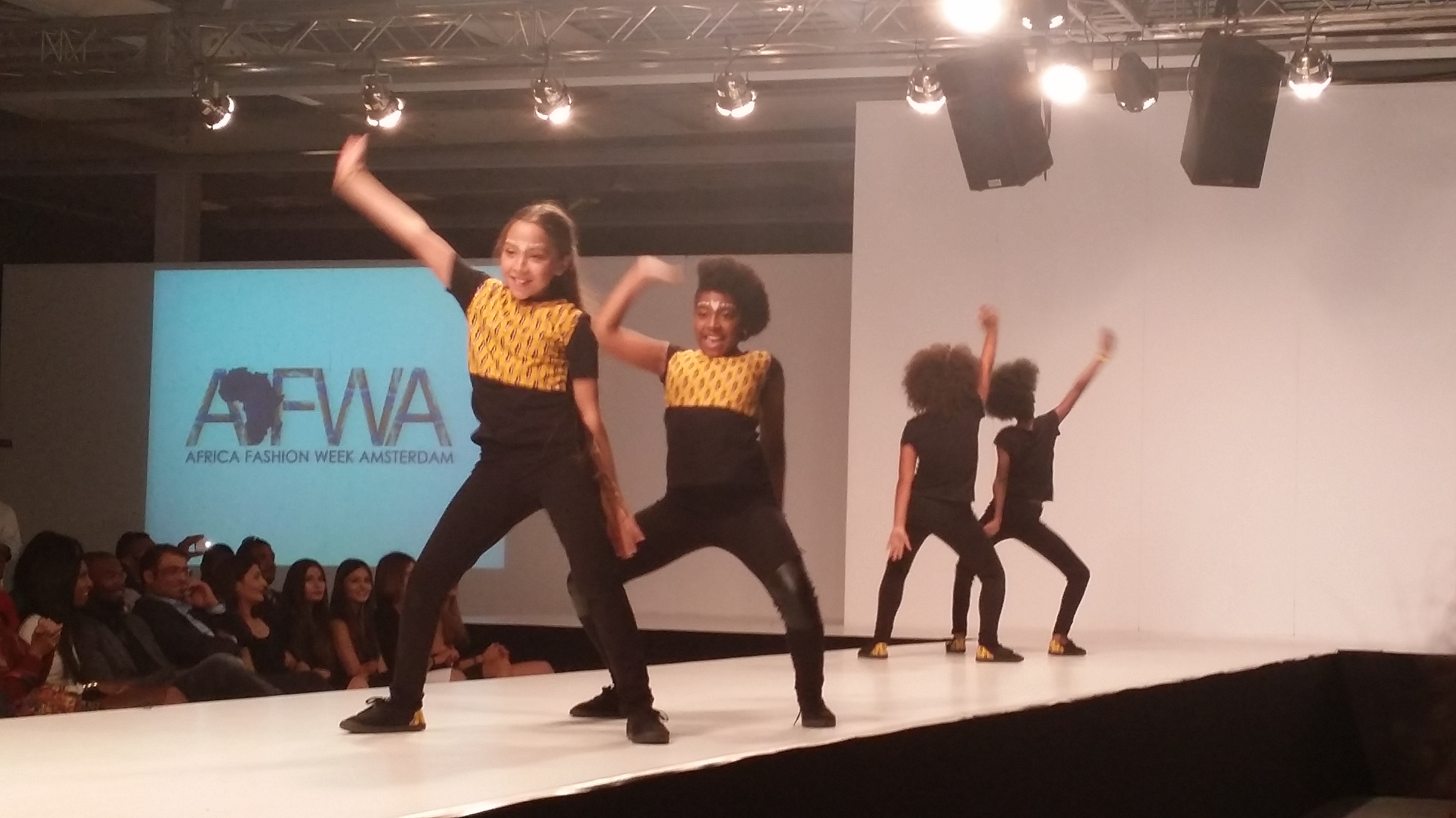 But in reality this perfect time table kinda fell through as the breaks in between fashion shows were longer than planned. For this day the organisation choose to do three segments of shows; each segment consisted out of two fashion shows with entertainment in between each show, followed by a break that allowed the models and designers, and hair and make up people to prepare for the next segment. The kick off runway show for day 2 was from Blackpearl Secret by Diana Tambe, the founder of AFWA who is also a young designer from Cameroon, based in the Netherlands. In her garments the modern Western influence is very present mixed with African influences. It is the mixture of these two different styles that makes the designs of Blackpearl Secret very appealing. Diana got very emotional when doing her walk on the runway. Her hard work for this first edition paid off. Right after the Blackpearl runway show it was time for the first entertainment group of the night, the kids dance group Petit Bagaza. They did a wonderful afro dance routine, which unfortunately can’t be shown to you as the choreographer made it clear that the show is not to be seen on the internet. Therefore the uploaded video had to be removed. After the dance show it was glitter on the runway with the show of UK based contemporary women’s clothing brand THOA (The House Of Adjeiwaah) by Ghanian designer Abena Adjeiwaah. Segment one was done and it was time for the second break of the evening.