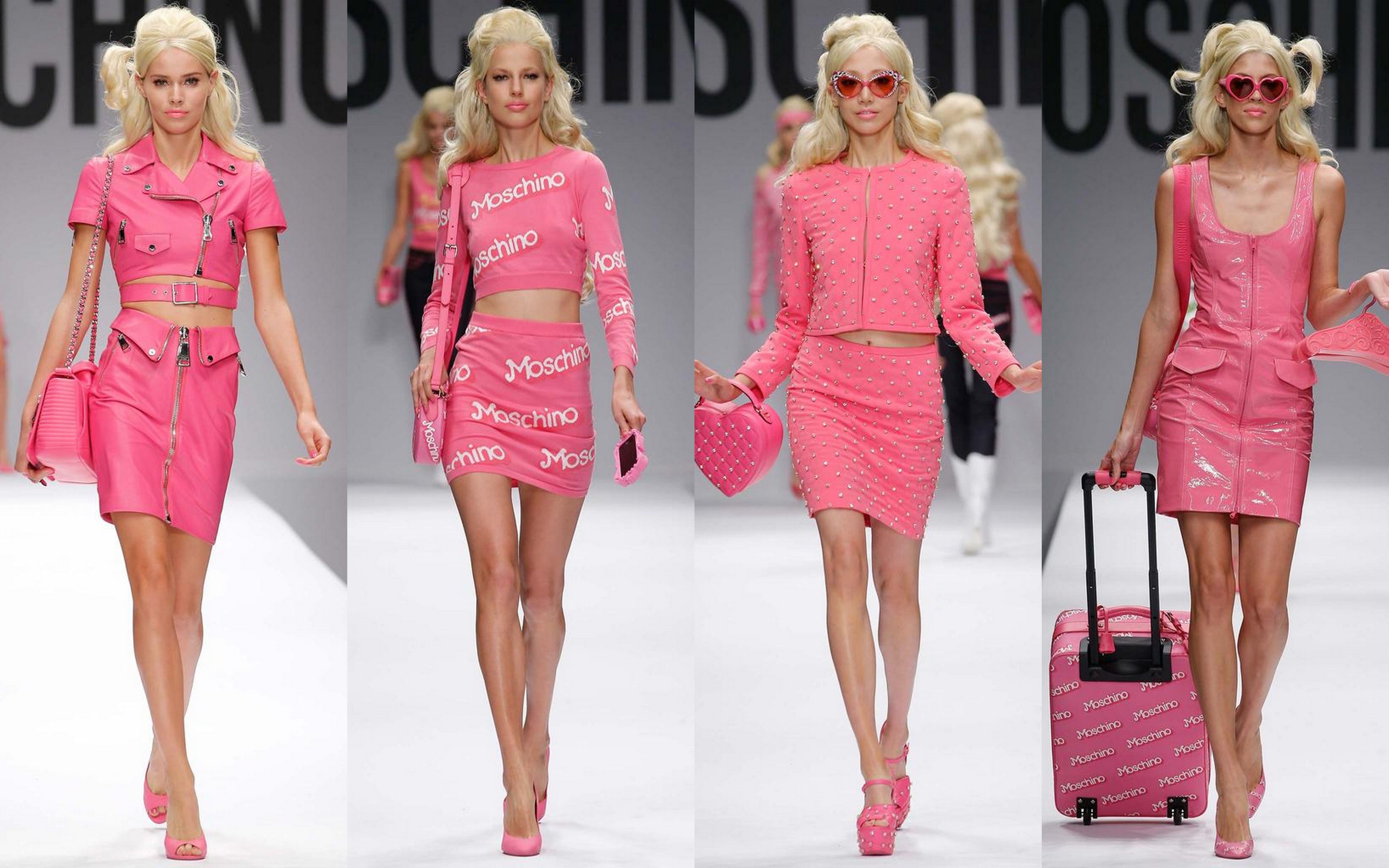 Just last season Jeremy Scott gave a big wink to McDonald’s and Chanel for Moschino’s Fall/Winter 2014-2015 collection where he also included my yellow happy friend Spongebob. This time he’s got his inspiration from Mattel’s most famous creation and every little girls dream: Barbie. While growing up I wasn’t a big fan of the Barbie doll itself (I wasn’t much of a doll person), I was always a fan of her looks. Those bubblegum pink outfits, flashy accessories, glamorous shoes and fabulous handbags…ooh I secretly dreamed of having a fun fashionable wardrobe like that when I grew up. Looking at Barbie dolls I knew in the back of my head that fashion was somewhere in my future. Watching this fashion show was like watching your childhood fashion role model walking down the runway. Along came Corporate Barbie, Sporty Barbie, Malibu Barbie, Prom Barbie, Glamour Barbie… They were all there.