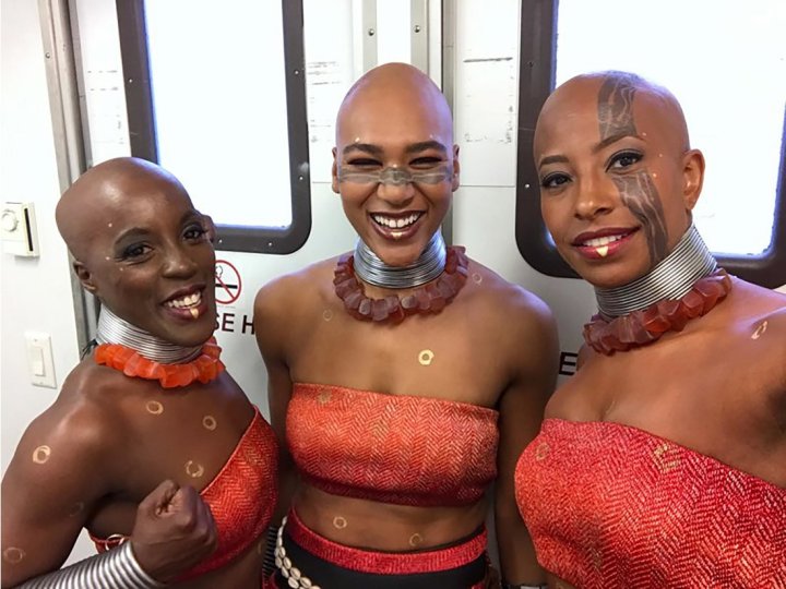 Warrior costumes worn by the Dora Milaje, Okoye, Nakia and Shuri. This includes the strapless top warrior look: